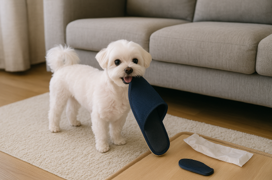 비슷한 경험은 한 번 더 있었습니다. 어느 날 저녁, 거실에서 TV를 보던 중 몽이가 갑자기 제 슬리퍼를 물고 와 소파 앞에 툭 떨어뜨렸습니다. 처음엔 장난인 줄 알았는데, 곧 제 앞에 와서 앉아 슬리퍼를 보며 꼬리를 흔들었습니다. 마치 “이거 신고 나랑 산책 가자”라고 말하는 것 같았습니다.