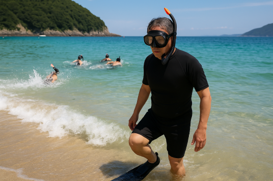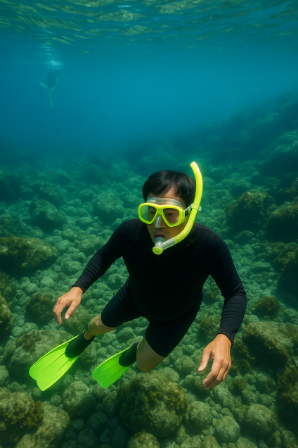 외항에 도착하자마자 우리는 짐을 들고 길을따라 이동했다. 강사님이 준비해둔 스노클링 장비를 하나씩 나눠주었는데, 마스크와 스노클, 오리발을 받아 드니 묘한 긴장감과 설렘이 동시에 찾아왔다. 젊은 친구들은 장비를 착용하자마자 곧장 물로 뛰어들었다. 물보라가 튀고 웃음소리가 퍼졌다. 반면 나는 발끝으로 천천히 바닷물의 차가움을 느끼며 조금씩 들어갔다. 바닷물이 생각보다 차가워 천천히 몸을 담구며 적응해나갔다. 마스크를 얼굴에 맞추고 스노클로 호흡을 시작하자, 전혀 다른 세계가 눈앞에 펼쳐졌다.