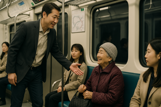 만원 버스에서 노약자나 짐이 많은 사람에게 자리를 양보한 일.